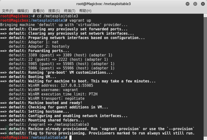 第一次执行vagrant up会往虚拟机中安装各种软件,和配置虚拟机中的漏洞。