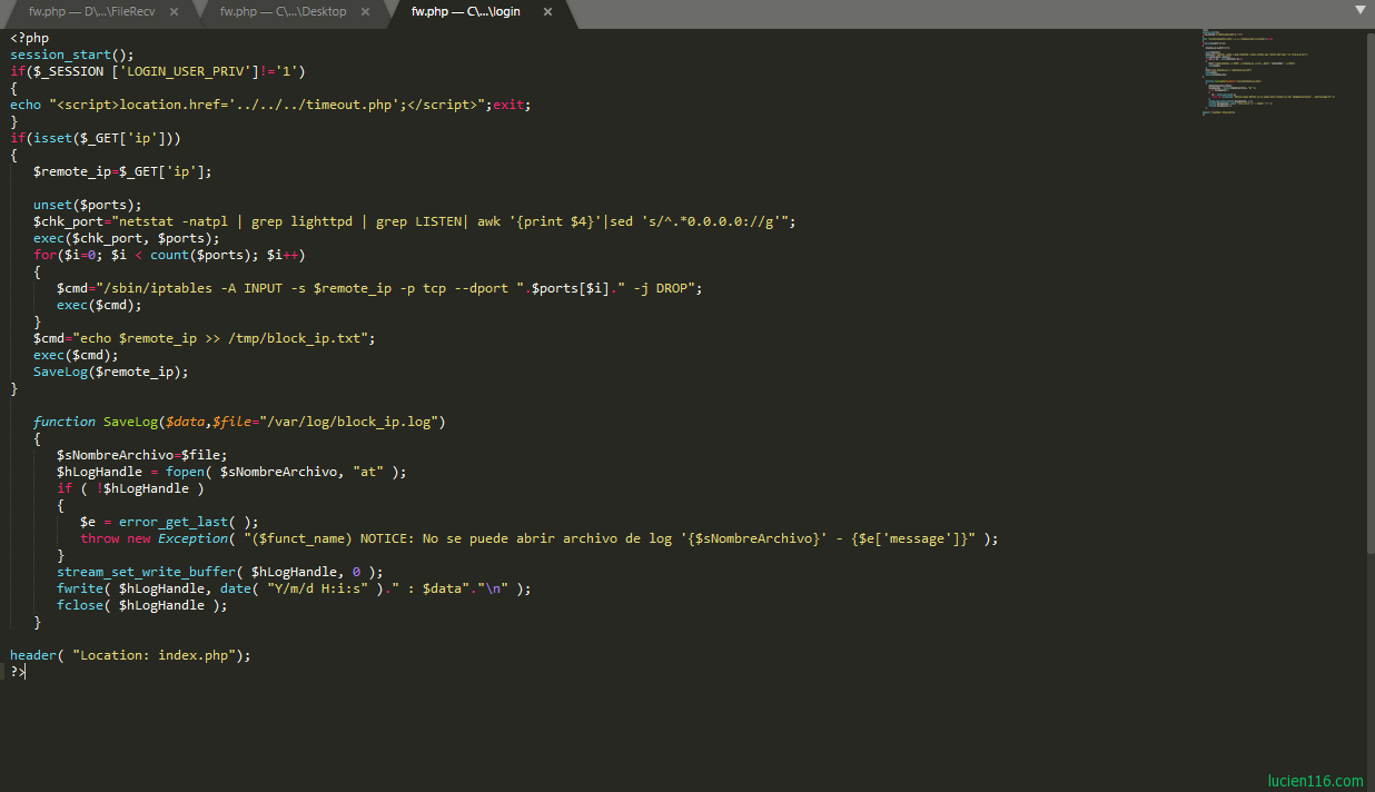 通过日志可以发现漏洞存在于fw.php文件,入侵者通过执行wget 命令远程下载入侵者服务器上名为1.php的一句话后门。找到了问题所在接下来查看fw.php这个文件: