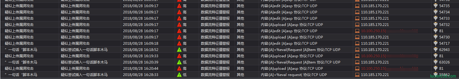 通过监测发现,2018-8-28-15:30左右安全设备产生大量“上传漏洞攻击”和“一句话木马”的告警,发现攻击源为IP:110.185.170.221 地理位置:四川成都;被攻击IP:10.100.250.15 端口:81 ,该服务器为xxx公司网站英文版(www.xxx.com),如下图: